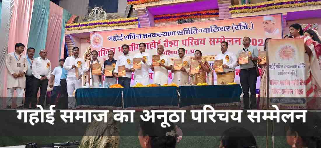 ग्वालियर, मध्य प्रदेश: आज अखिल भारतीय गहोई वैश्य समाज का परिचय सम्मेलन तेरापंथी धर्मशाला नई सड़क ग्वालियर मे गहोई वैश्य शक्ति जन कल्याण समिति के तत्वाधान में आयोजित किया गया है कार्यक्रम में मंचासीन मुख्य अतिथि कैबिनेट मंत्री श्री नारायण सिंह कुशवाहा,श्री आशीष अग्रवाल मध्यप्रदेश भाजपा मीडिया प्रभारी, सुधीर गुप्ता जिला भाजपा उपाध्यक्ष महानगर ग्वालियर, पूर्व राष्ट्रीय अध्यक्ष राधेश्याम कुचिया, संस्थापक संयोजक प्रदीप पहारिया महिला महासभा राष्ट्रीय अध्यक्ष श्रीमती गीता नगरिया, अंकित कट्ठल, मंचासीन रहे कार्यक्रम में राष्ट्रकवि डॉ मैथिलीशरण गुप्त जी के चित्र पर माल्यार्पण व दीप जलाकर कार्यक्रम का शुभारंभ किया एंव परिचय स्मारिका का विमोचन किया।