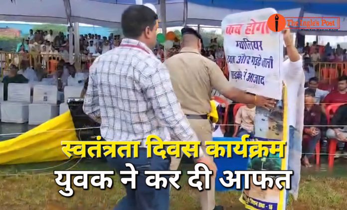 ग्वालियर मध्य प्रदेश: स्वतंत्रता दिवस के कार्यक्रम के दौरान एक और जहां मंच से सरकार और प्रशासन अपनी बड़ी बड़ी उपलब्धियां गिनाता है और अपने कीर्तिमान।के झंडे गाड़ते नजर आता है। उसको आईना दिखाने के लिए एक युवक अचानक मैदान में पहुंच गया। युवक ने जिस तरह से अपने शरीर पर बैनर पोस्टर लगाए हुए थे और जिस तरह के संदेश उस पर लिखे हुए थे उस से शासन और प्रशासन की जमकर किरकिरी हुई। हालांकि प्रशासनिक अधिकारी तुरंत एक्शन मोड में आए और युवक को पकड़कर मैदान से ले गए।